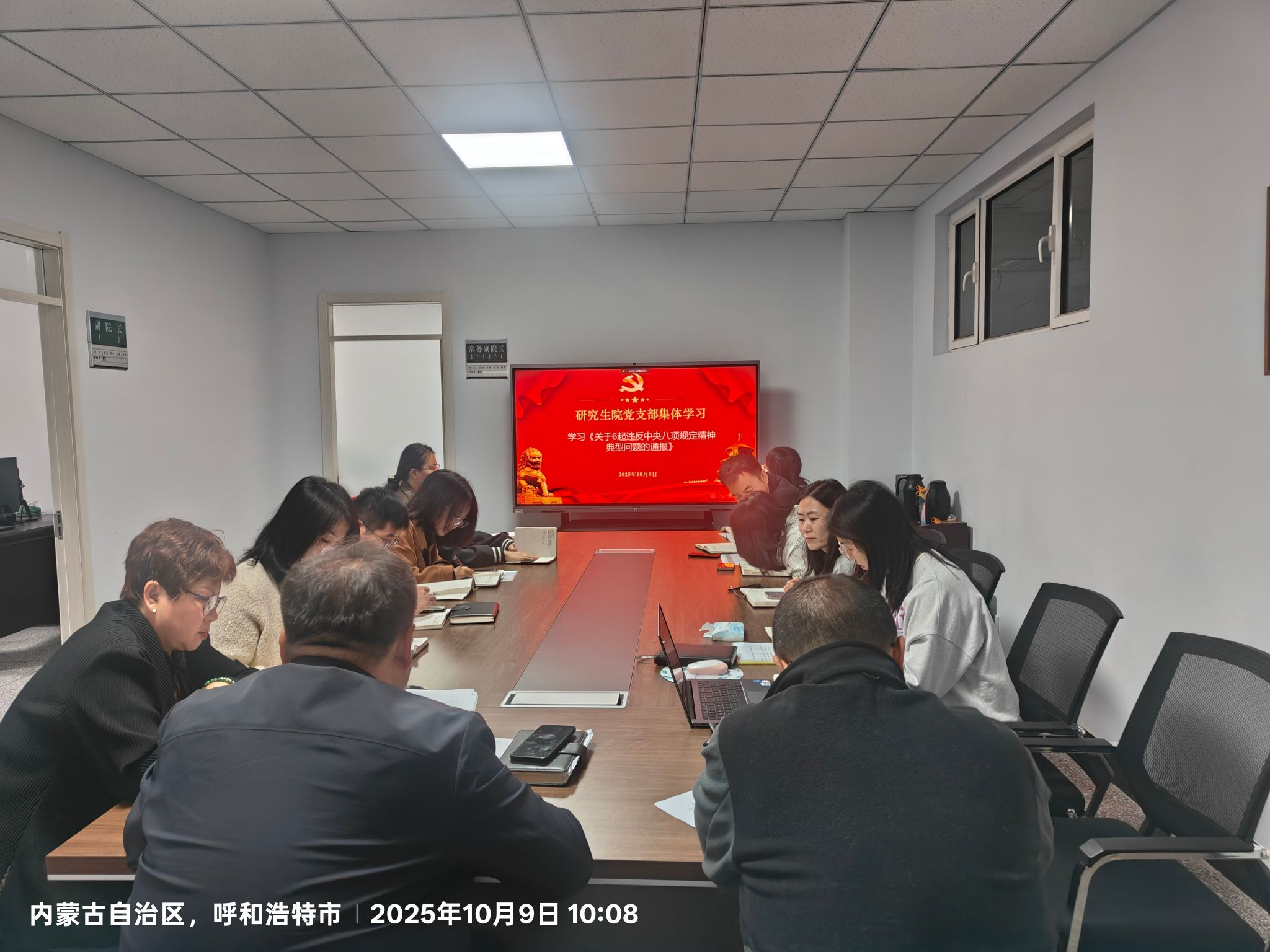 2025年10月9日上午10点,研究生院召开本年度第28次院务会,支部组织全体教职工开展专题学习,集中学习了《关于6起违反中央八项规定精神典型问题的通报》。此次会议由党支部书记白东义同志主持,支部全体党员参加学习并展开深入讨论。